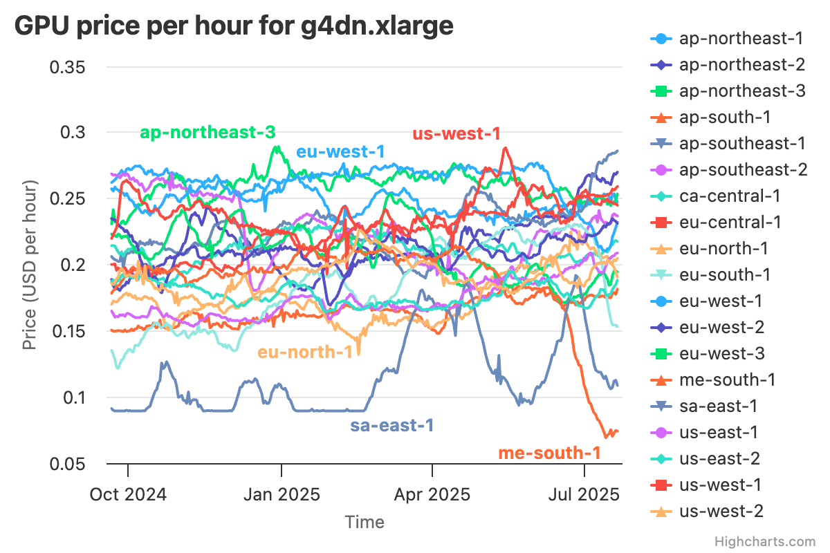 Что стоит около0,07 долл. США за графин в часвMe-South-1 (Бахрейн)тогда какСингапур (AP-Southeast-1)платят0,28 долл. США за графин в часдля той же услуги. В Gordianlabs мы часто видим разницу в стоимости 2-4x по сравнению с центром обработки данных от одного поставщика.