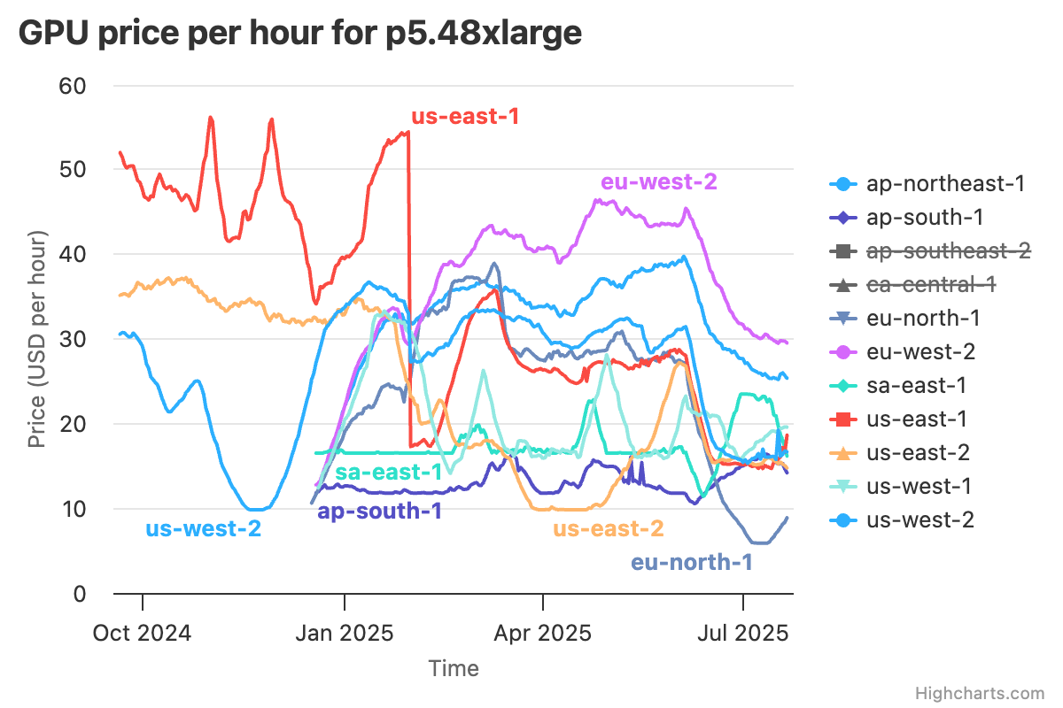Ценообразование в области облачных графических процессоров является движущейся целью. В зависимости от поставщика, региона и типа экземпляра, цены на экземпляры могут качаться2x - 5x в течение нескольких днейПолем По требованию и зарезервированные цены также различаются, с ограниченной прозрачностью в спросе, предложении или основных тенденциях.