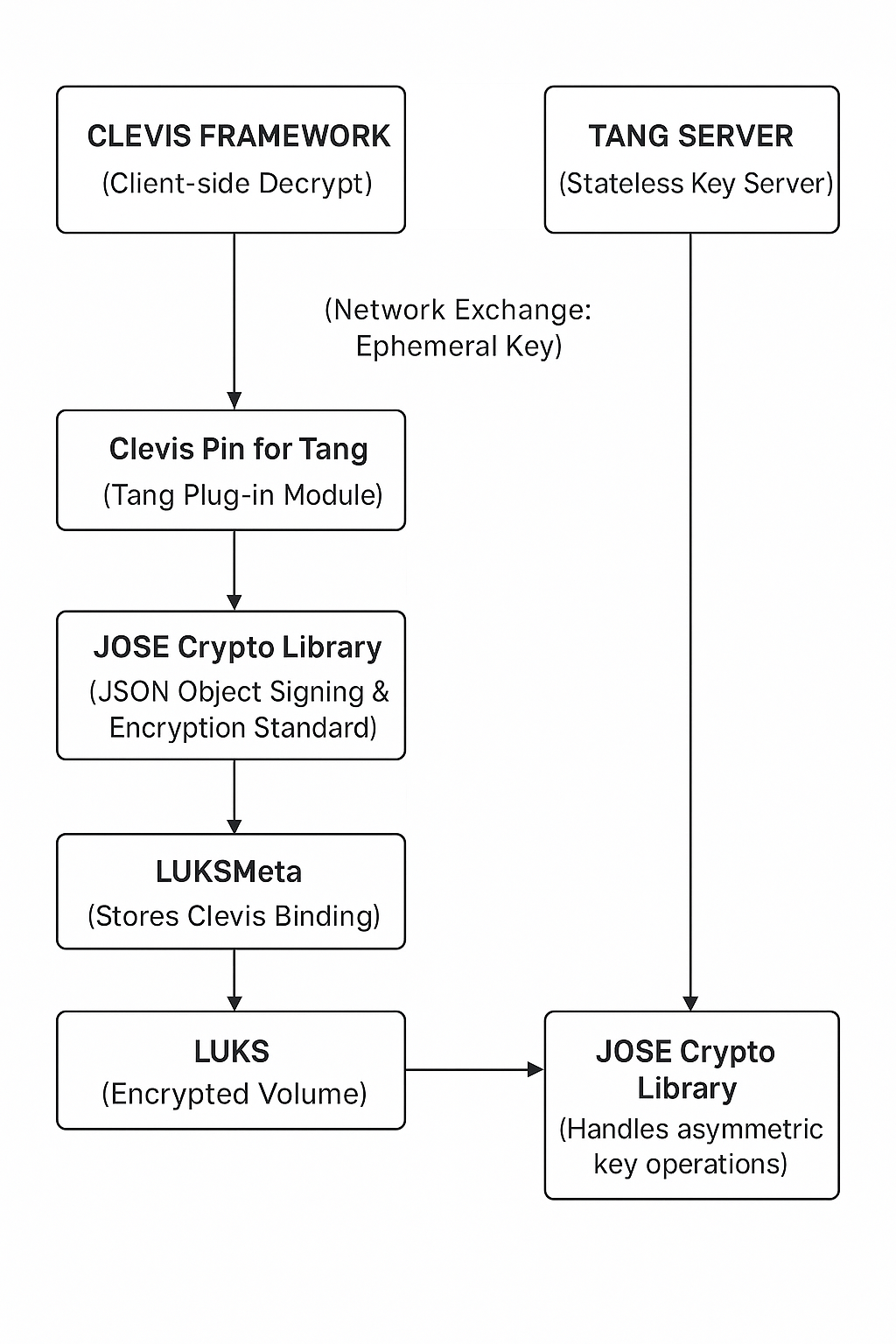- Clevis использует PIN -код TANG для связи с сервером TANG и выполнения безопасного обмена ключами.